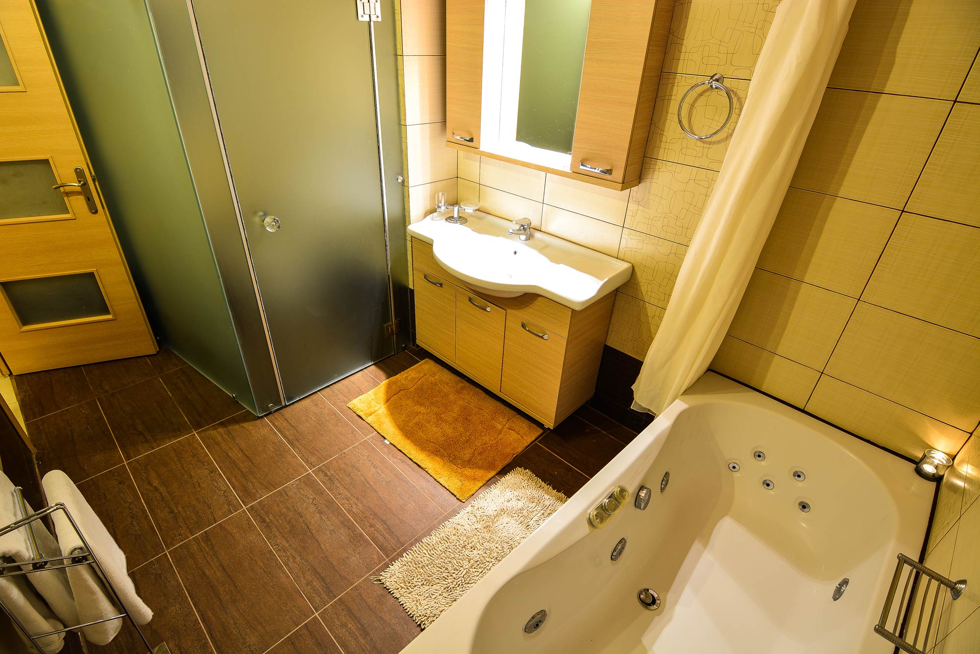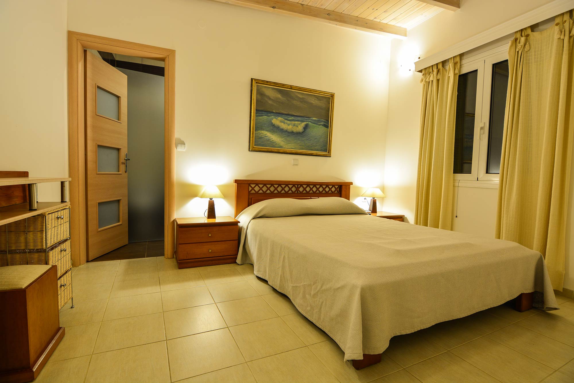 Η εσωτερική διαμόρφωση περιλαμβάνει καθιστικό με μονό κρεβάτι, υπνοδωμάτιο με δύο μονά κρεβάτια, μπάνιο με ντουζιέρα, καθώς και κυρίως κρεβατοκάμαρα με διπλό κρεβάτι και ιδιωτικό μπάνιο με μπανιέρα υδρομασάζ. Η διάταξη των χώρων επιτρέπει άνετη φιλοξενία πολλών ατόμων, διατηρώντας παράλληλα την ιδιωτικότητα κάθε επισκέπτη.
